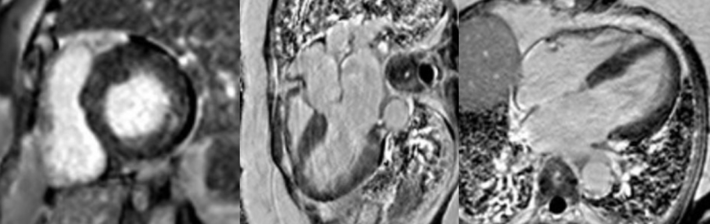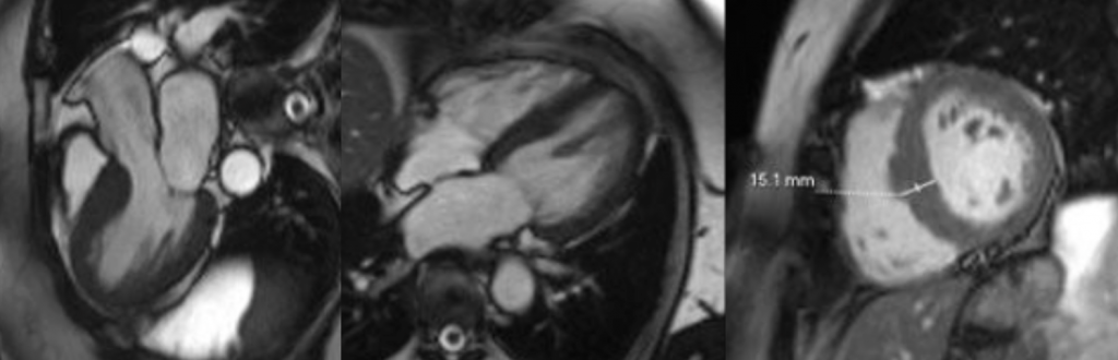 Cardiac magnetic resonance imaging performed in December 2020 demonstrated global concentric left ventricular hypertrophy, with a basal septal thickness of 1.5 cm at end diastole. Left ventricular volumes and systolic function were preserved, with an ejection fraction of 68%. There was no evidence of left ventricular outflow tract obstruction or systolic anterior motion of the mitral valve.