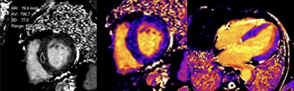 Cardiac magnetic resonance imaging plays a pivotal role in the diagnosis of Fabry cardiomyopathy. The combination of concentric LVH, focal mid-wall late gadolinium enhancement affecting the basal inferolateral wall, and markedly reduced native myocardial T1 values represents a characteristic imaging signature. Reduced native T1 reflects intracellular lipid accumulation and allows confident differentiation from infiltrative cardiomyopathies such as amyloidosis, which typically demonstrate elevated native T1 values, and from sarcomeric hypertrophic cardiomyopathy, which lacks a consistent enhancement pattern.