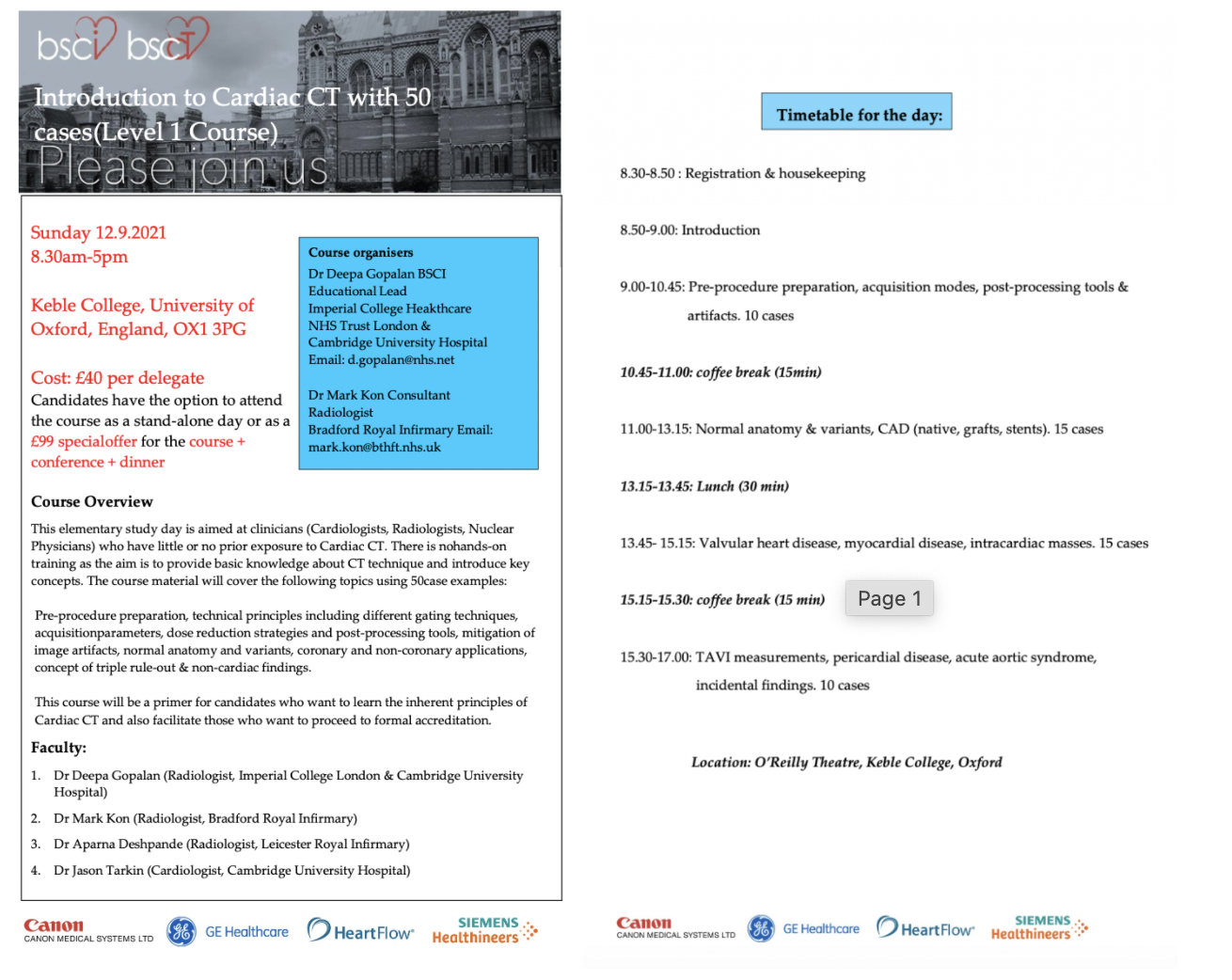 - BSCI / BSCCT Introduction to Cardiac CT Level 1 – Registration £50.00 until 15 Aug / from 16 Aug £100 (VIEW PROGRAMME)